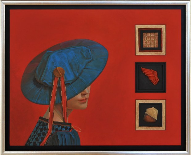 The red in the background, contrasting with the saturated blue of the hat, symbolizes the life and emotions that tear people in the moment of doubt. Red raises the brim of the hat and the secret hidden in a woman’s face. Blue color is a symbol of harmony and balance. My painting is an attempt to find an answer to the mystery hidden in the world and human life. It is an unfathomable mystery that is realized in the conscious observer.